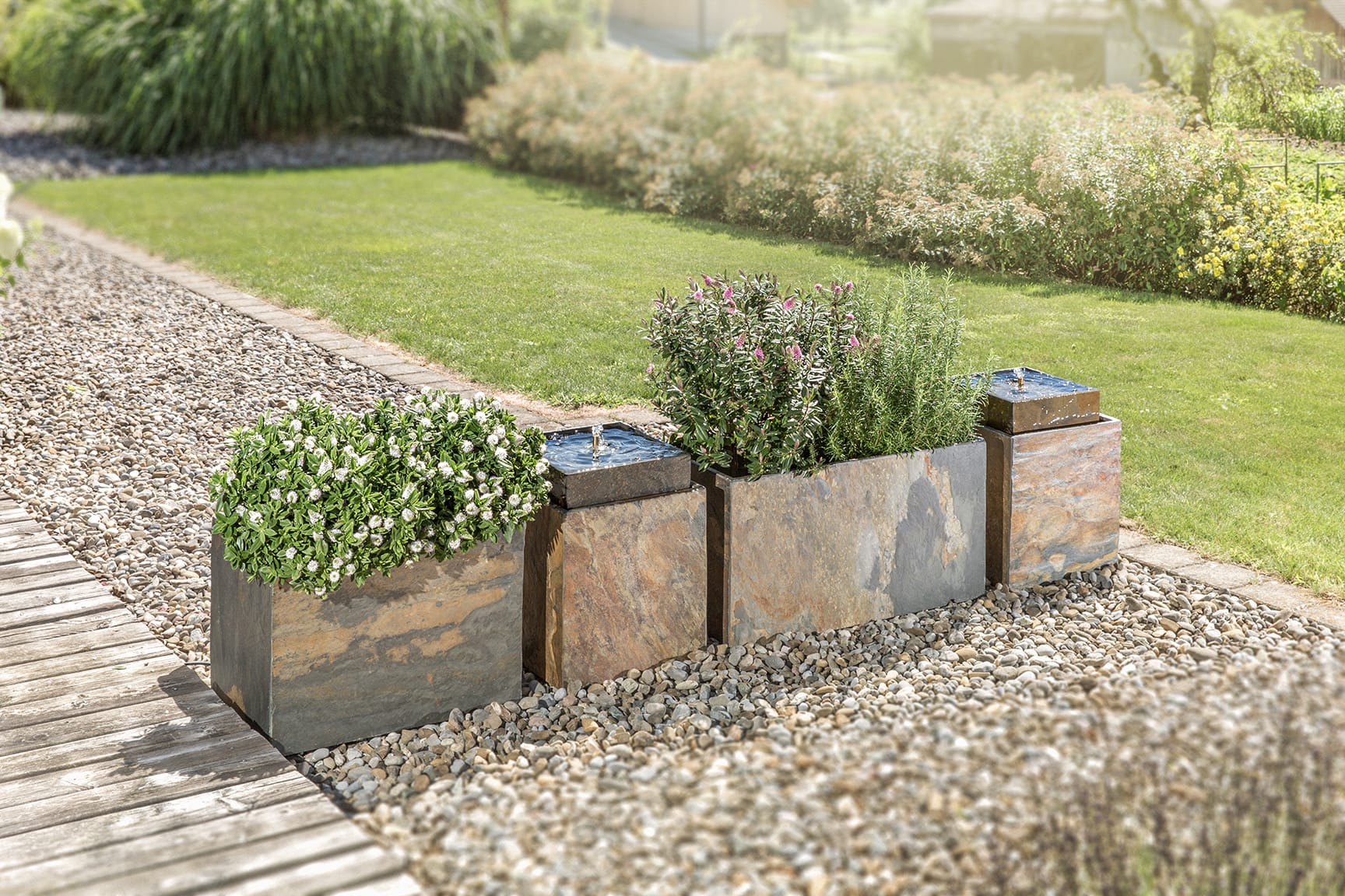 Bei deiner Gartengestaltung sind dir keine Grenzen gesetzt. Durchstöbere unser Sortiment und entdecke die zahlreichen Variationen und kreiere so dein ganz persönliches Natur-Arrangement. Zu Gartenbrunnen passen besonders gut CLIMAQUA® Pflanzgefässe und -kübel oder CLIMAQUA® Dekofeuer und Lounge-Kamine. Wie wäre es zum Beispiel, wenn du zwei üppig mit deinen Lieblingspflanzen bepflanzte Blumentöpfe aus echt Schiefer direkt rechts und links von einem kubischen Outdoor Brunnen, ebenfalls aus echt Schiefer platzierst? So ist ein harmonisches Gesamtbild garantiert.
