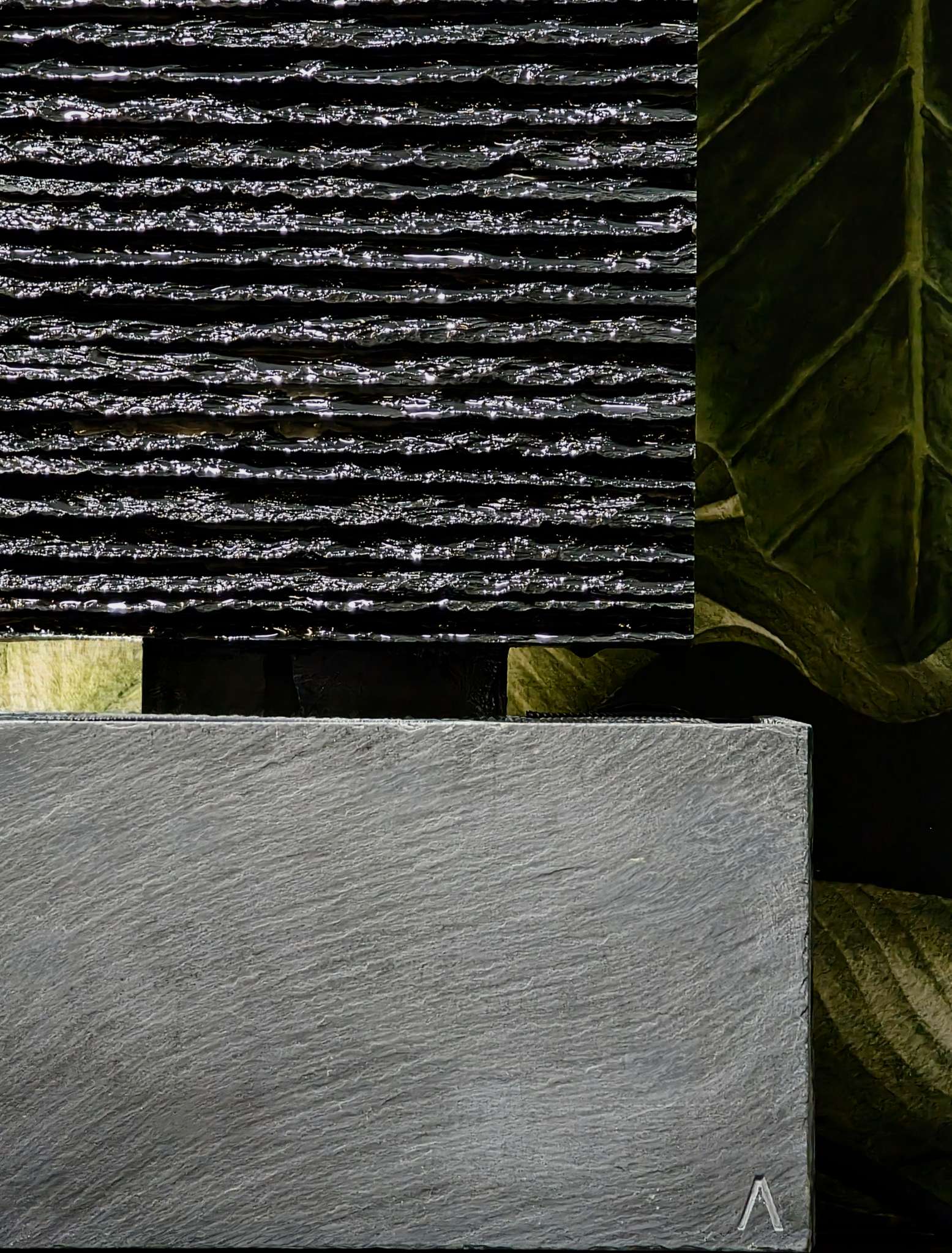 Les murs d'eau CLIMAQUA sont fabriqués à la main à partir d'ardoise naturelle de haute qualité, une pierre parfaite pour cela grâce à ses propriétés uniques. L'ardoise naturelle confère au mur d'eau une finition élégante et assure une très longue durée de vie. Un mur d'eau CLIMAQUA est conçu pour durer et vous procurera de nombreuses années de plaisir.