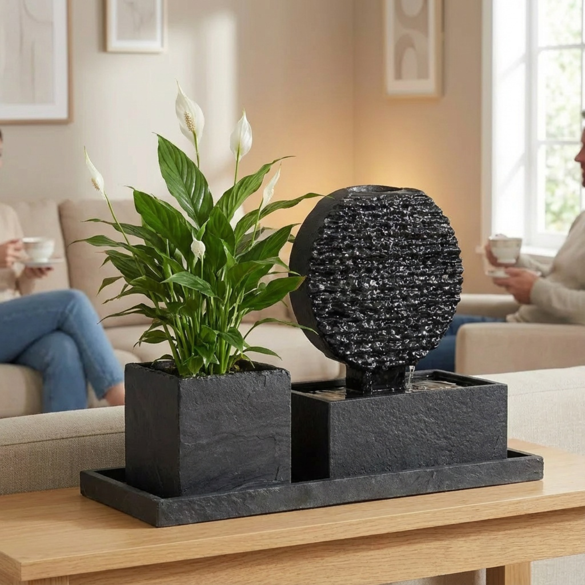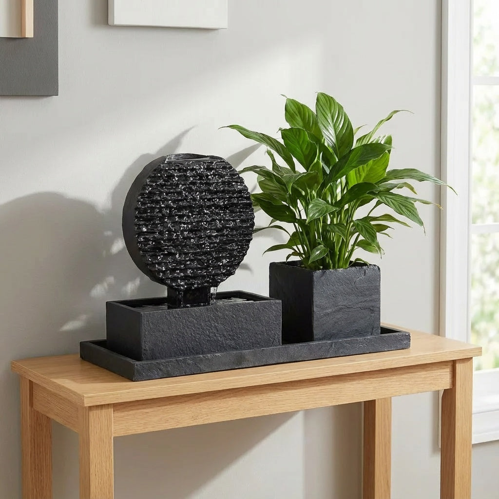 Das Herzstück deines Sets: Der kompakte Zimmerbrunnen aus echtem Schiefer bringt das beruhigende Element Wasser in dein Zuhause – für entspannte Atmosphäre, angenehmere Raumluft und ein einzigartiges Wohngefühl, auch auf kleinem Raum.