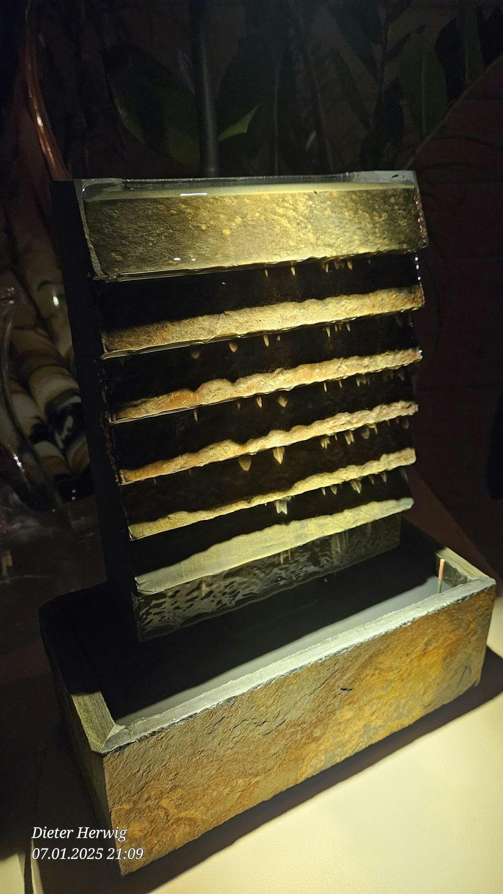 Brunnen aus Stein, mit warmer, Beleuchtung, ein echter Blickfang. Anders, als bei Brunnen aus Plastik, plätschert das Wasser natürlich. Habe ihn schon zum 2ten Mal gekauft, weil er beim zügeln verloren ging. Toller Brunnen!